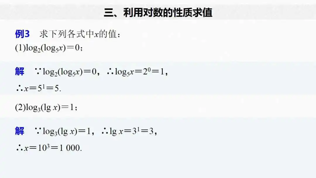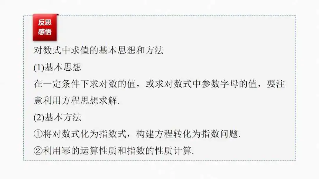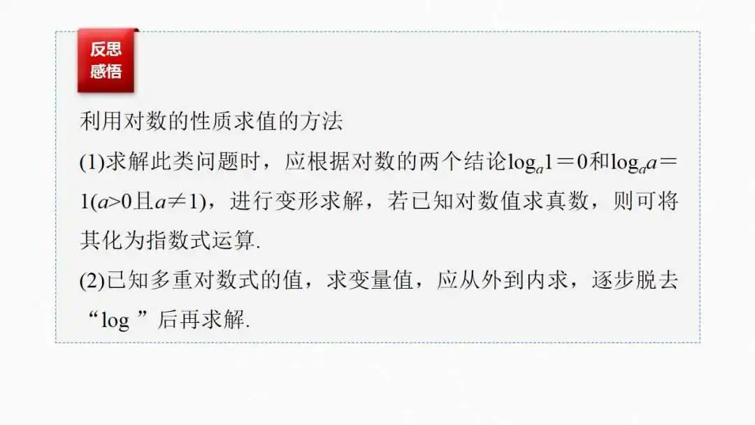 在一定条件下求对数的值,或求对数式中参数字母的值,要注意利用方程思想求解.
