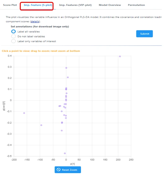 S-plot图的横坐标表示主成份与代谢物的协相关系数,纵坐标表示主成份与代谢物的相关系数。