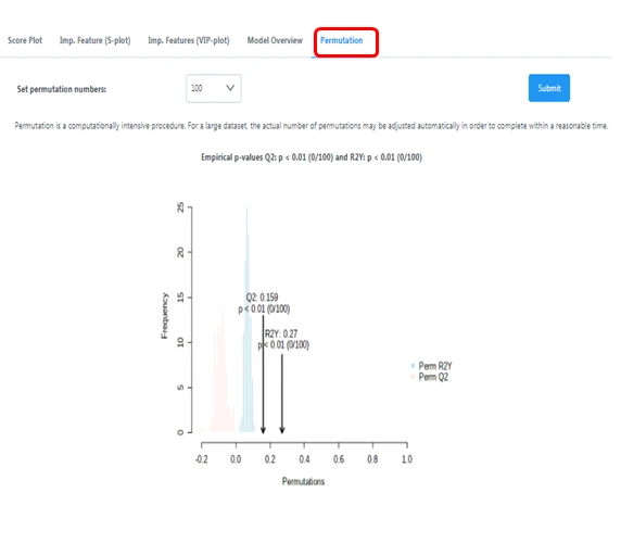 模型验证permutation Test图的横坐标表示模型的准确率,纵坐标表示100次permutation Test中100个模型的准确率的频数,箭头表示本OPLS-DA模型准确率所在的位置。其中R2X和R2Y分别表示所建模型对X和Y矩阵的解释率,Q2表示模型的预测能力,理论上R2、Q2数值越接近1说明模型越好,越低说明模型的拟合准确性越差。通常情况下, R2、Q2高于0.5较好,高于0.4即可接受。