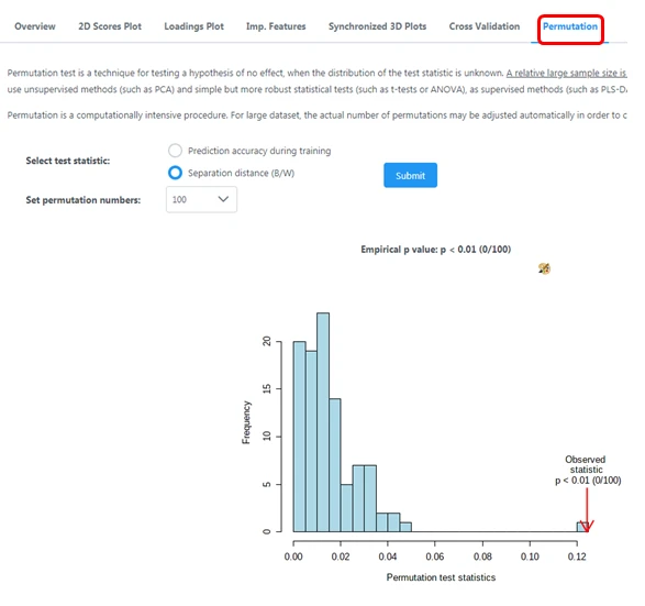 模型验证permutation Test图的横坐标表示模型的准确率,纵坐标表示100次permutation Test中100个模型的准确率的频数,箭头表示本PLS-DA模型准确率所在的位置。
