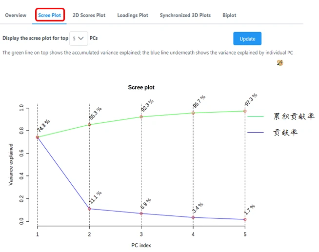 碎石图(scree plot)即贡献率图,是希望图形一开始很陡峭,如悬崖一般,而剩下的数值都很小,如崖底的碎石一样。显示各主成分的特征值贡献率。如图中显示PC1贡献率为74.2%,PC2贡献率为11.1%...