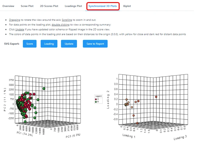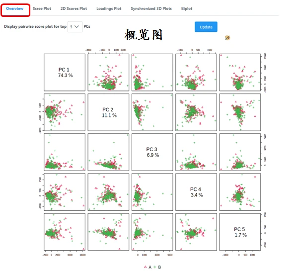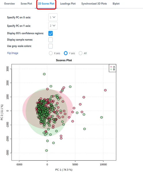PCA得分图有二维和三维两种展示形式,在二维得分图中横坐标PC1表示第一主成分,纵坐标PC2表示第二主成分,百分比表示该主成分对数据集的解释率,圆圈表示95%的置信区间;图中的每个点表示一个样品,同一个组的样品使用同一种颜色表示,Group为不同的分组;PCA得分图可以让我们非常直观地看出各个样本之间的相似性。例如在一张PCA得分图中,数个样本的点聚在一起,那么就说明这几个样本之间的相似性非常高,反之,如果几个样本的点非常分散,则说明这几个样本之间的相似性比较低。还可以看出组间是否有差异、QC样本是否稳定。