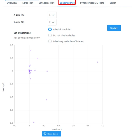 荷载图:把主成分1和主成分2的荷载点出一个二维图以直观的显示它们如何解释原来的变量的,这个图就叫做荷载图。每个点对应该物质对第一主成分和第二主成分的相关系数。相关系数的绝对值越大说明主成分对该变量的代表性越大。
