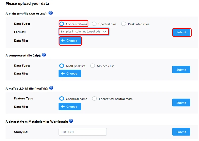 数据类型选择浓度;数据格式选择样品在每一列(未配对),可根据实验数据实际情况选择样品在每一行或是每一列、配对或未配对实验;选择上传的文件,提交即可。