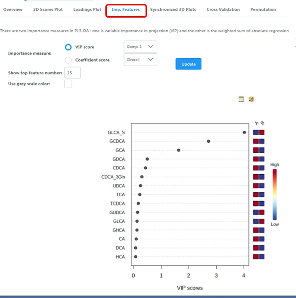 VIP ( Variable Importance in Projection scores )变量重要性投影,通过变量投影重要度衡量各代谢物组分含量对样本分类判别的影响强度和解释能力,辅助标志代谢物的筛选。通常以VIP值>1作为筛选标准。