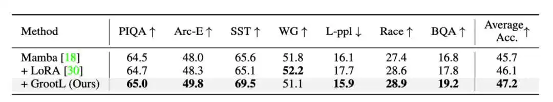 我们将 130M 参数量的 Mamba 作为基础模型。为了验证我们的 GrootL 在自然语言理解中的有效性,我们首先用相同的训练设置在 Alpaca 数据上分别通过 LoRA 和 GrootL 对预训练 Mamba 进行微调。接着在公开 lm-evaluation-harness 项目中对多个 NLP benchmark 进行 zero-shot 验证,结果如图 9 所示。
