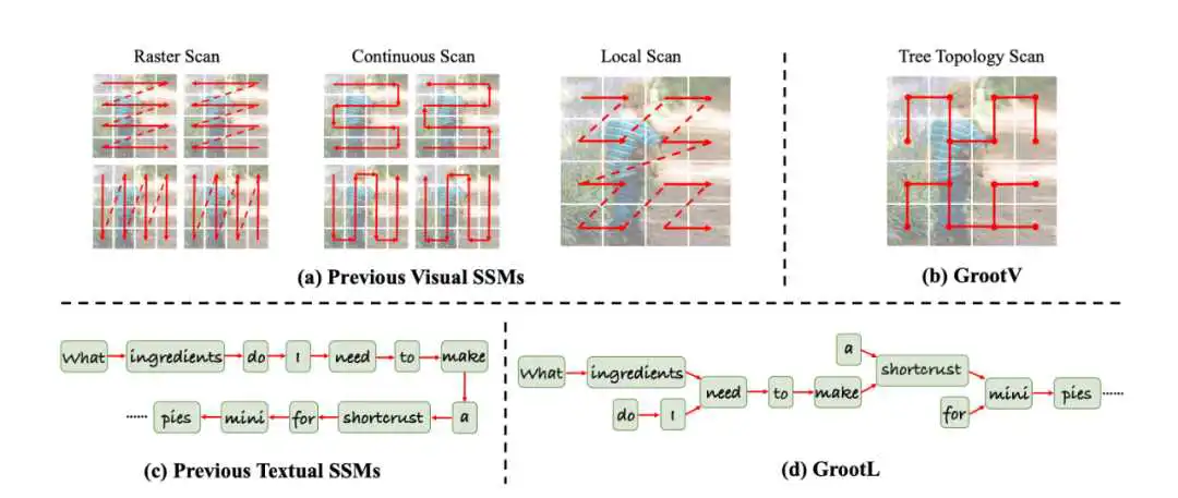 本文试图探索一个新的视角——为状态空间模型中的特征传播引入输入感知的拓扑网络。为了实现这一点,我们开发了一个树状态空间模型如图 2 所示,并提出了一个称为 GrootVL 的新框架,该框架根据输入特征自适应地生成树拓扑结构,然后在其上执行特征传播。