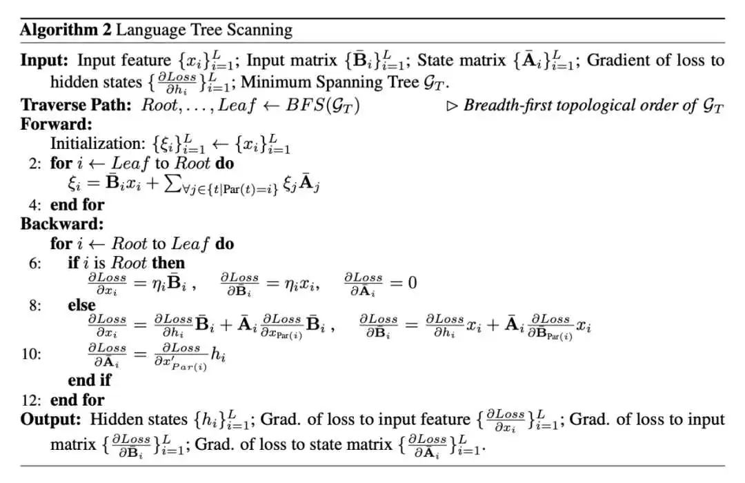 对于文本任务,我们按照语言的因果性质执行单向聚合方法如算法 2(图 4)所示。此外,我们为视觉树扫描和语言树扫描过程提供了反向传播过程以进行端到端的训练,其详细证明见论文附录 C。