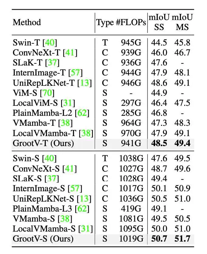 T、C 和 S 分别表示 Transformer、CNN 和 SSM 的模型类型。所有模型都以 224×224 的图像尺寸作为输入。