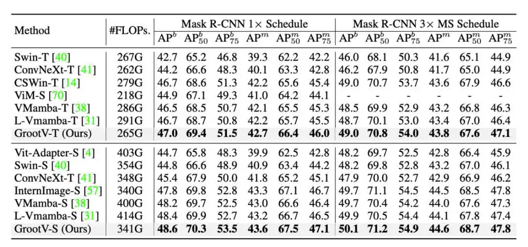 我们在图像分类,目标检测,实例分割与语义分割下游视觉任务上进行验证。如图 6、7、8 中结果所示,我们的方法显著优于各类基于状态空间模型的方法,并能与最先进的基于 CNN 或者 Transformer 架构的方法相媲美。