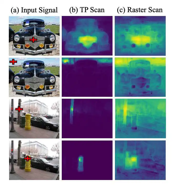 ▲ 图11. 特定位置的Affinity Map,位置由输入信号中的红色十字标记。TP Scan代表树拓扑扫描算法与光栅扫描 (c) 相比,它能准确捕获更详细的结构信息。