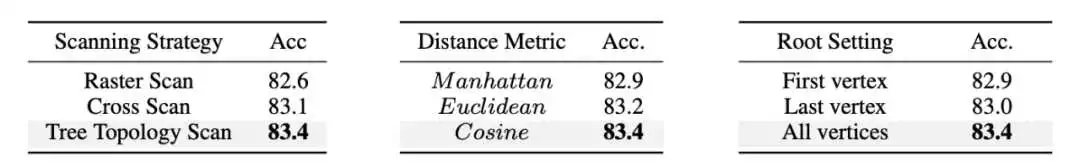 我们对树拓扑算法中多个配置进行消融实验。我们首先验证了树拓扑扫描相对于人工预设的光栅扫描和交叉扫描方式的优越性。接着,我们探索了相邻节点间边权重的刻画方式,尝试了曼哈顿距离,欧式距离和余弦距离三种方式。最后,我们仅针对单个节点进行状态聚合进行了实验从而验证了每个节点均需获取来自其余顶点信息的必要性。