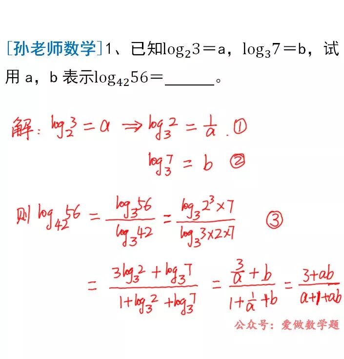 1、已知中的两个对数,一个真数为3,另一个底数为3,结合要求的对数,考虑把第一个对数使用对数换底公式化为3为底的对数,见①式,这样已知中的两个对数都是3为底的对数;接下来只需把要求的对数使用换底公式将其转化为两个也是3为底的对数相除,见③,至此不论是已知中还是结论中的对数都是以3为底的对数,同底对数问题没有多大难度,具体如下。