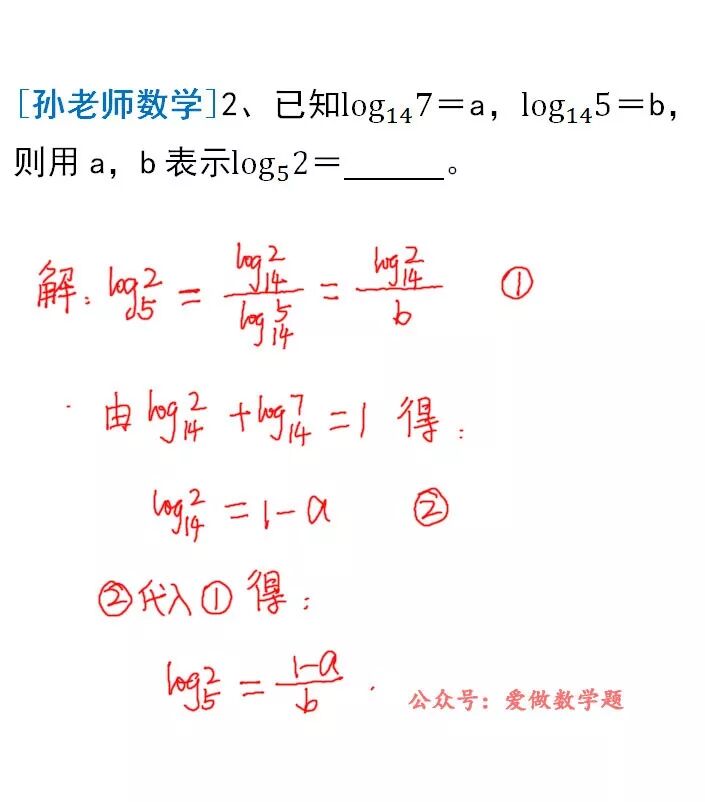 2、因为已知中的对数都是以14为底的对数,所以考虑把要求的对数使用换底公式化成两个14为底的对数相除,见①式,做到这里,解题思路基本明朗了,接下来只需求出14为底真数为2的对数的值就可以了。