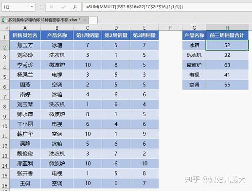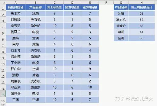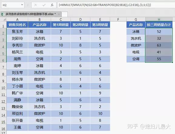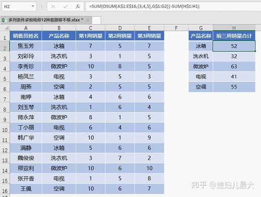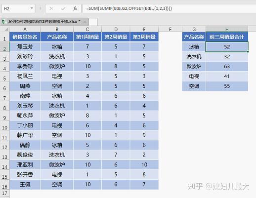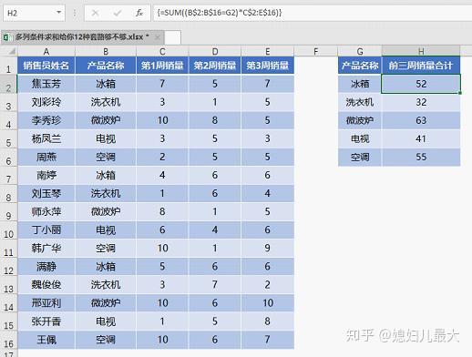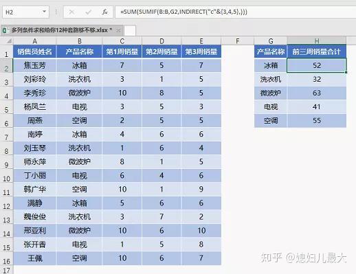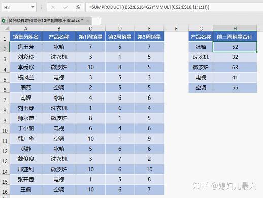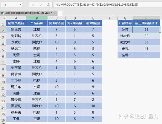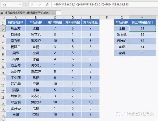 类似下图这样的数据,需要根据G列的产品名称在H列汇总数据。条件区域在B列,而要求和的数据在C、D、E三列中。这种求和就是按条件求多列数据之和,简称多列条件求和。