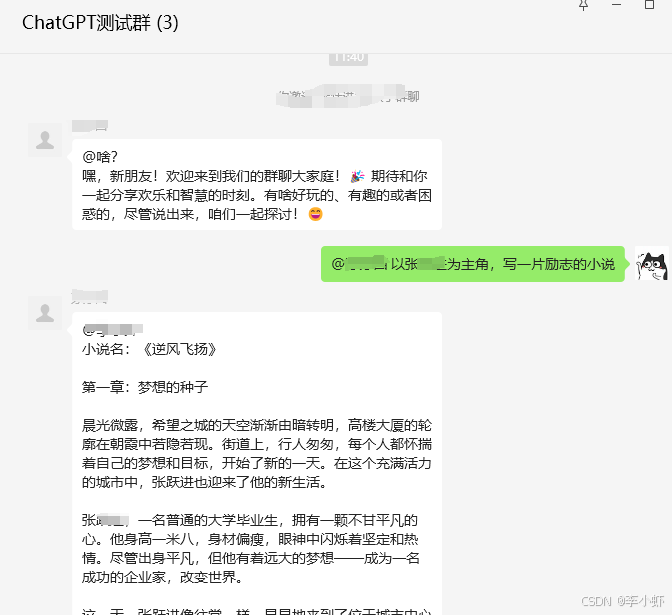 然后把微信拉倒设置白名单的群里,就可以当AI机器人回复了。期间微信必须一直在线,不能后台清除登录状态。