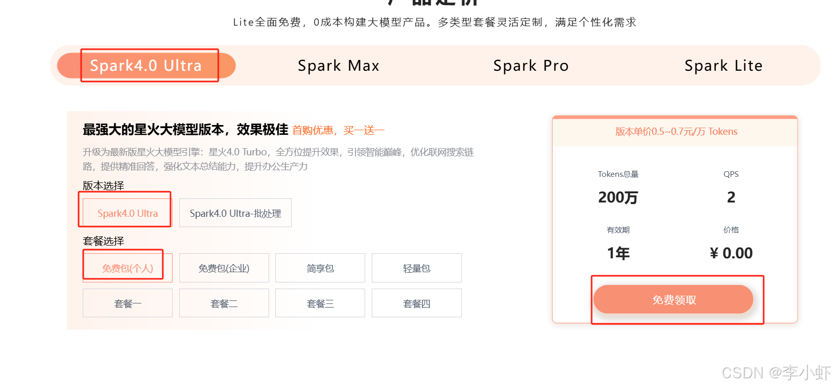 目前我使用的是讯飞的大模型,正巧是赶上他免得的时候,送200万TOKEN,可以好好的玩玩。首先去官方地址:打开链接 https://xinghuo.xfyun.cn/sparkapi?scr=price 点击免费试用即可