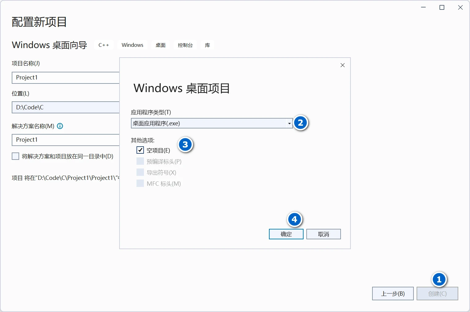 步骤4)在点击创建,并在应用程序类型下拉框中选择 :桌面应用程序。 另外,勾选空项目,避免在学习初期过多的杂项内容影响