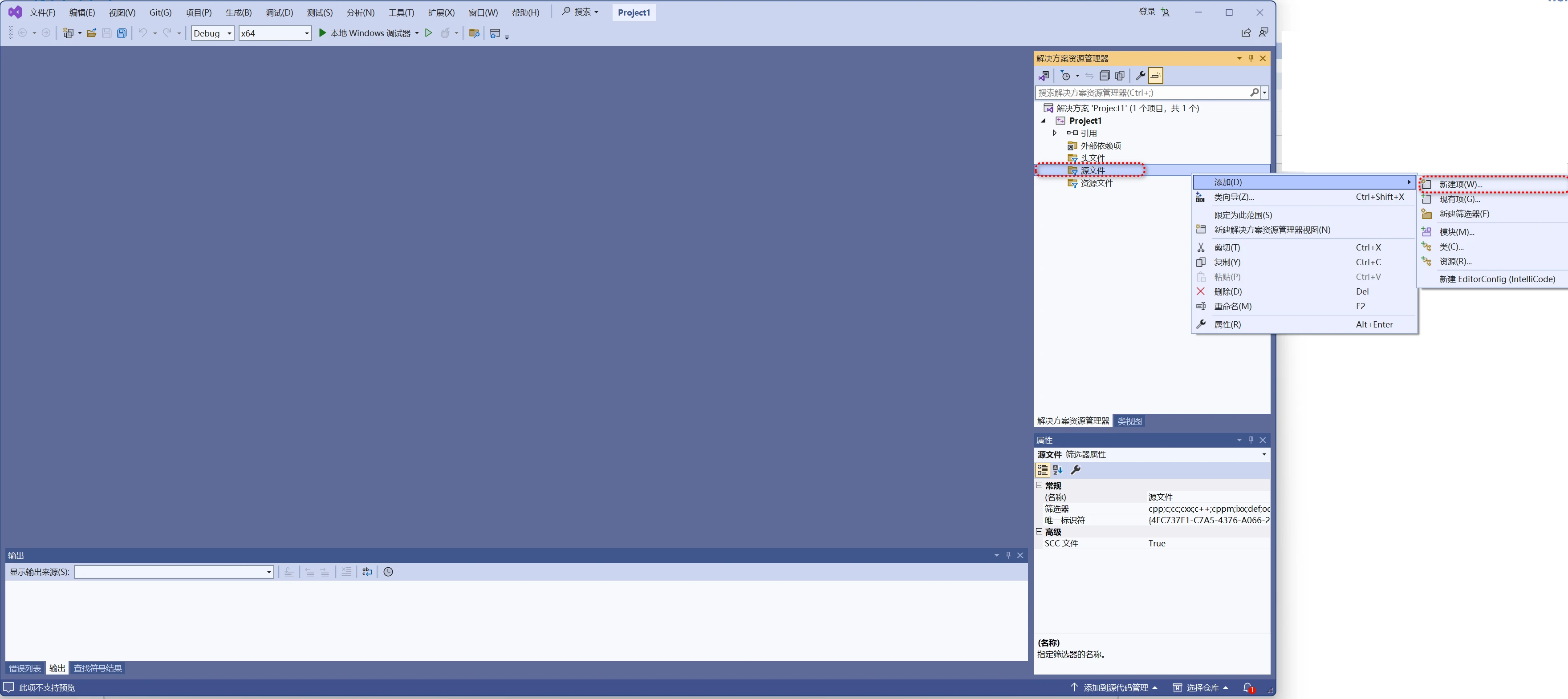 步骤5)在“源文件”的地方,鼠标右键,选择‘添加’ ,选择‘新建项’