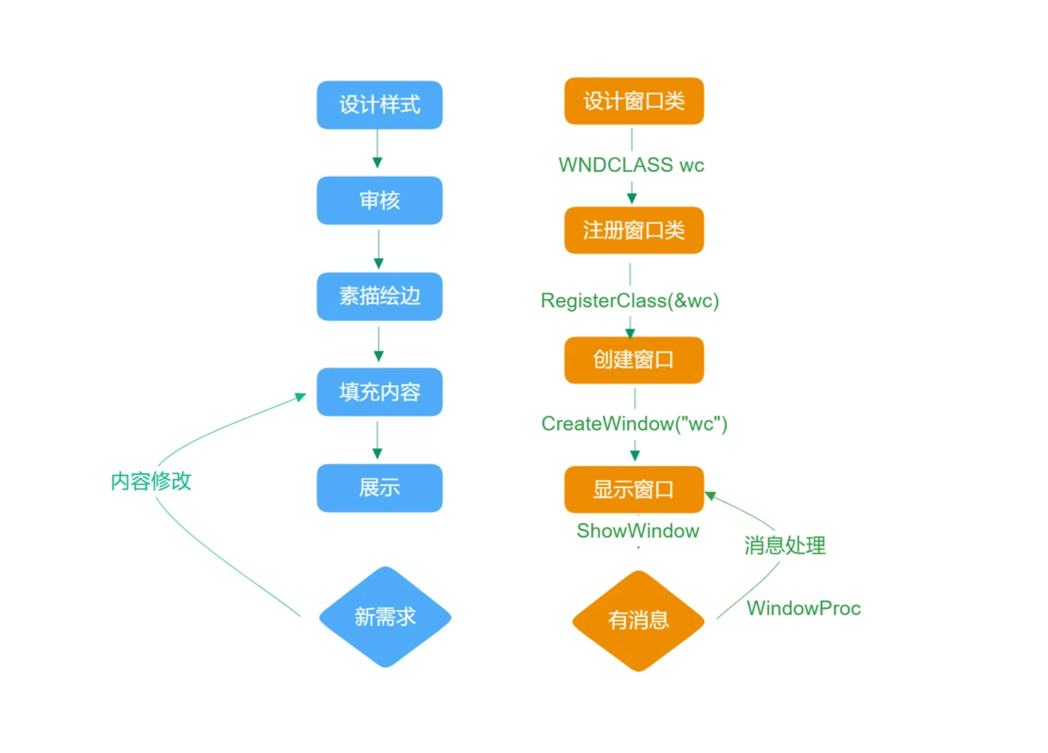 有了以上的初步概念,再转入Window API, 微软在提供接口函数(C语言)时,也基本类似这种流程