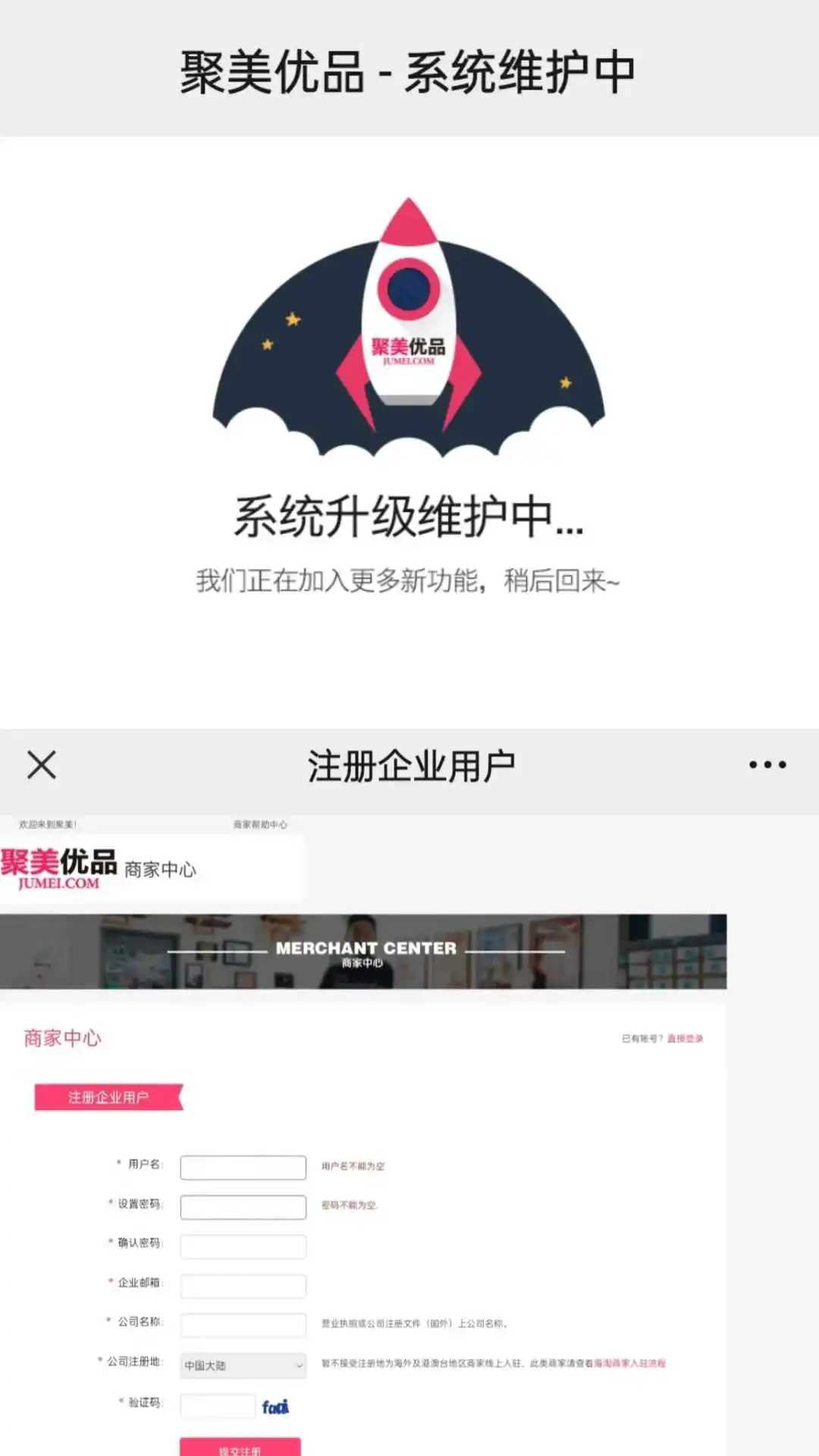 据红星资本局报道,目前聚美优品官网已经无法打开,页面显示“系统升级维护中”。不过,聚美优品商家中心网站还可以打开,商家可以在此网站提交注册申请。