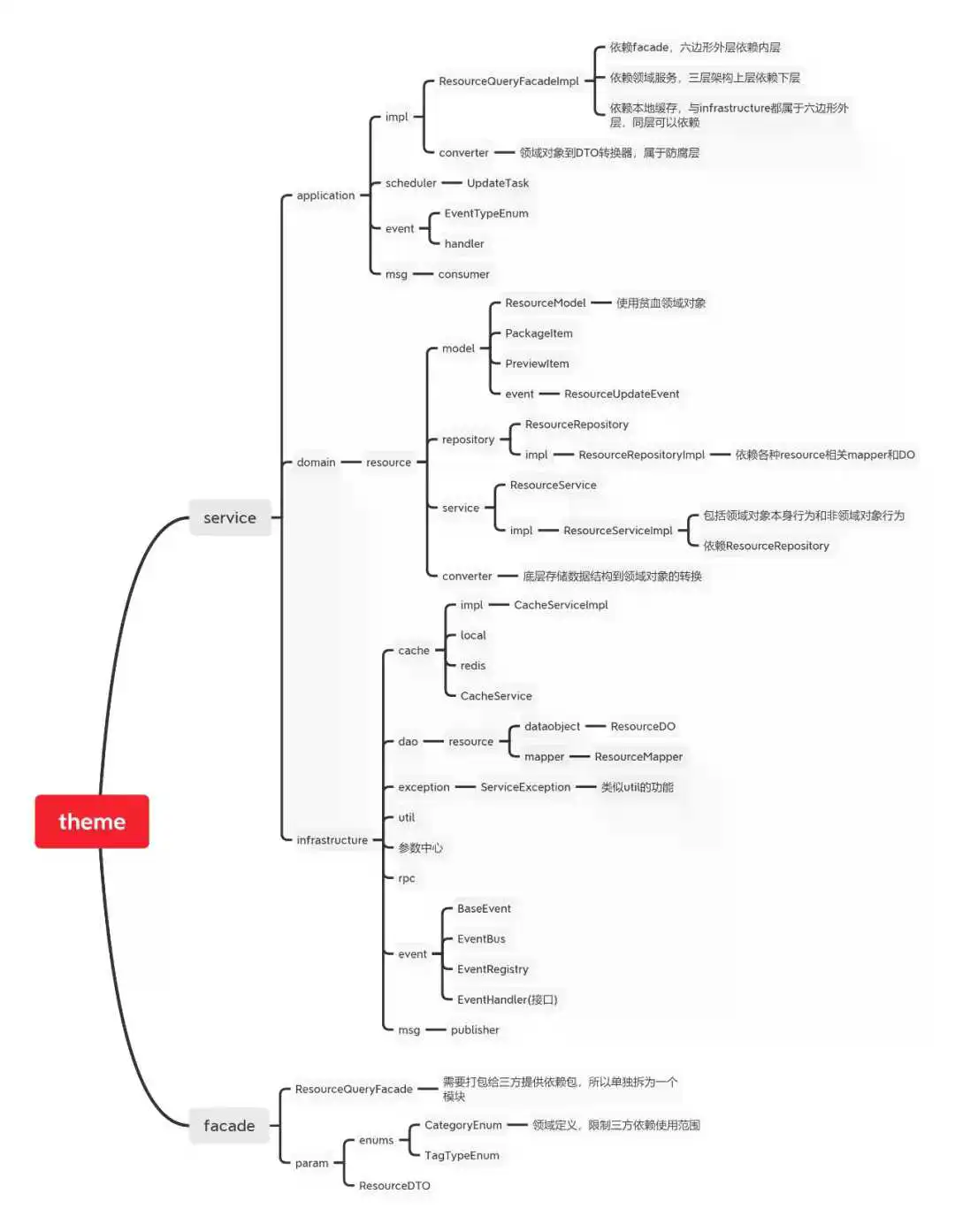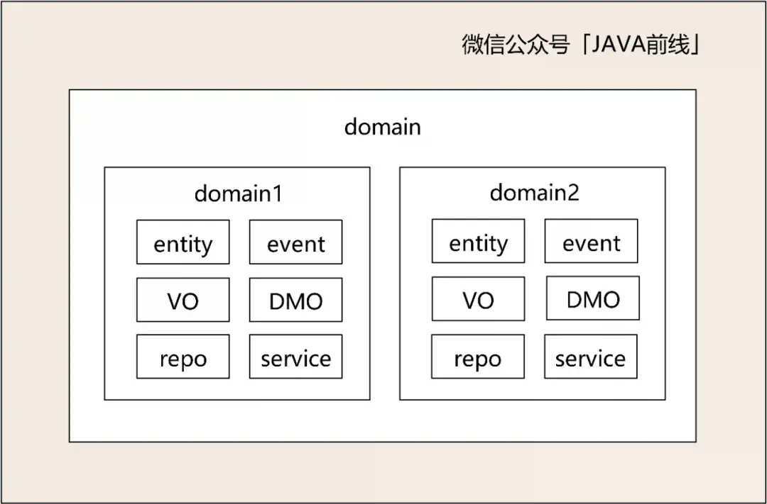 领域层:提供DMO(DomainObject)、VO、事件、数据访问对象,核心是按照领域进行分包,领域内高内聚,领域间低耦合