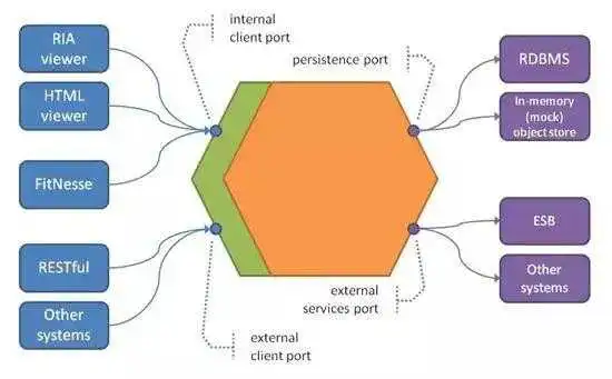 因此,不要将我们的应用程序视为一组图层,另一种方法是将其视为六边形[5],如图5所示。我们的最终用户使用的查看器以及FitNesse测试使用内部客户端API(或端口),而来自其他BC的调用(例如,RESTful用于开放主机交互,或来自ESB适配器的调用用于已发布的语言交互)命中外部客户端端口。对于后端基础架构层,我们可以看到用于替代对象存储实现的持久性端口,此外,域层中的对象可以通过外部服务端口调用其他BC。