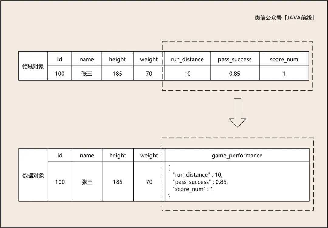 // 数据对象 public class FootballPlayerDO { private Long id; private String name; private Integer height; private Integer weight; private String gamePerformance; } // 领域对象 public class FootballPlayerDMO { private Long id; private String name; private Integer height; private Integer weight; private GamePerformanceVO gamePerformanceVO; } public class GamePerformanceVO { private Double runDistance; private Double passSuccess; private Integer scoreNum; }