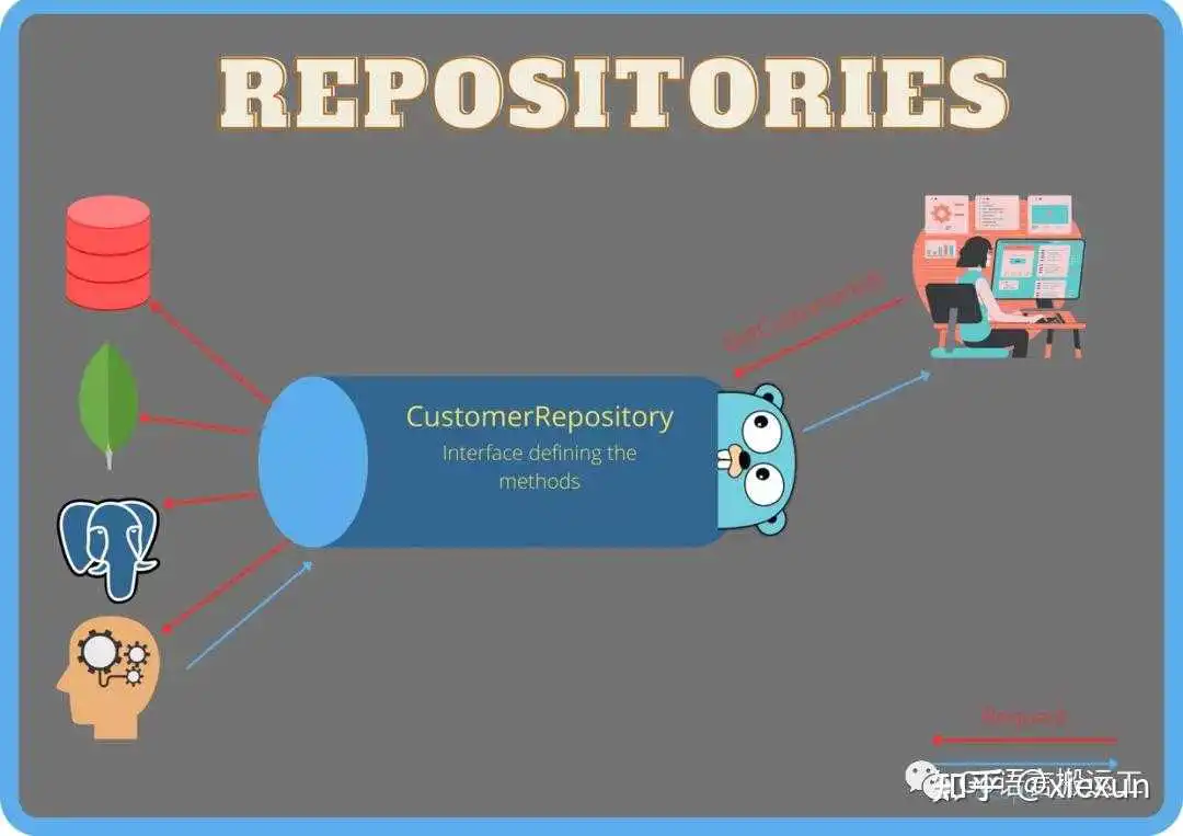 因为我们通常希望支持持久性存储的多个实现,所以存储库通常由具有不同持久性存储实现的不同实现的接口(例如,CustomerRepository)组成(例如,CustomerRepositoryHibernate或CustomerRepositoryInMemory)。由于此接口返回实体(域层的一部分),因此接口本身也是域层的一部分。接口的实现(与一些特定的持久性实现耦合)是基础结构层的一部分。