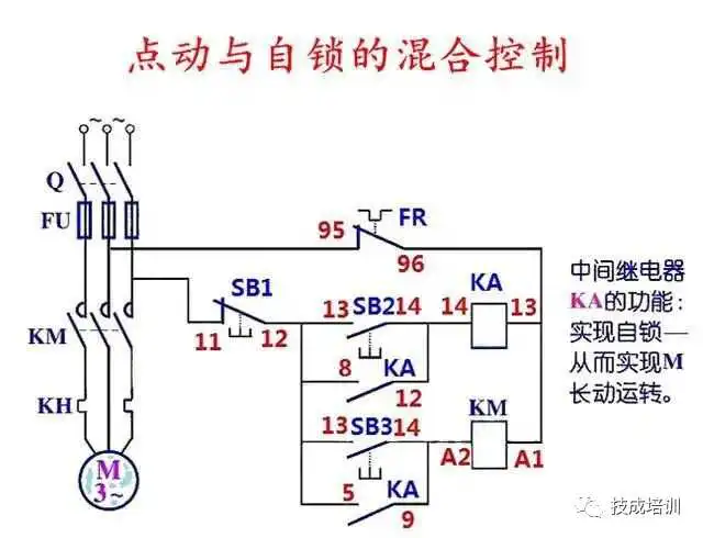 这种控制增加了一个中间继电器,当我们按下SB2时,中间继电器KA形成自锁,同时自身的常开点闭合KM线圈得电,按下SB1时KM和KA的线圈同时失电。按下SB3时接触器KM线圈得电松开SB3时KM线圈失电,点动控制。这种接线控制效果比较好,直接给大家上实物接线图吧。