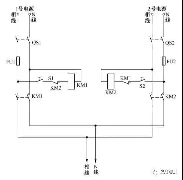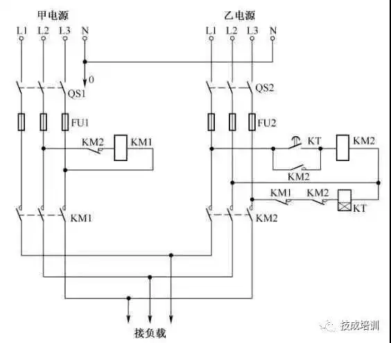 双电源切换应用非常广,两个接触器可实现自动切换,主电源的接触器线圈走继电器的常开触点,备用电源的接触器线圈走继电器的常闭触点。