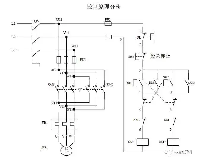 正向转动控制:合上电源开关Q,按下正向起动按钮SB2,接触器KM1的线圈通电并吸合,其主触点闭合,常开辅助触点闭合自锁,电动机M正向旋转。同时KM1的常闭辅助触点断开,避免接触器KM2通电。这时电动机所接电源的相序为A-B-C。
