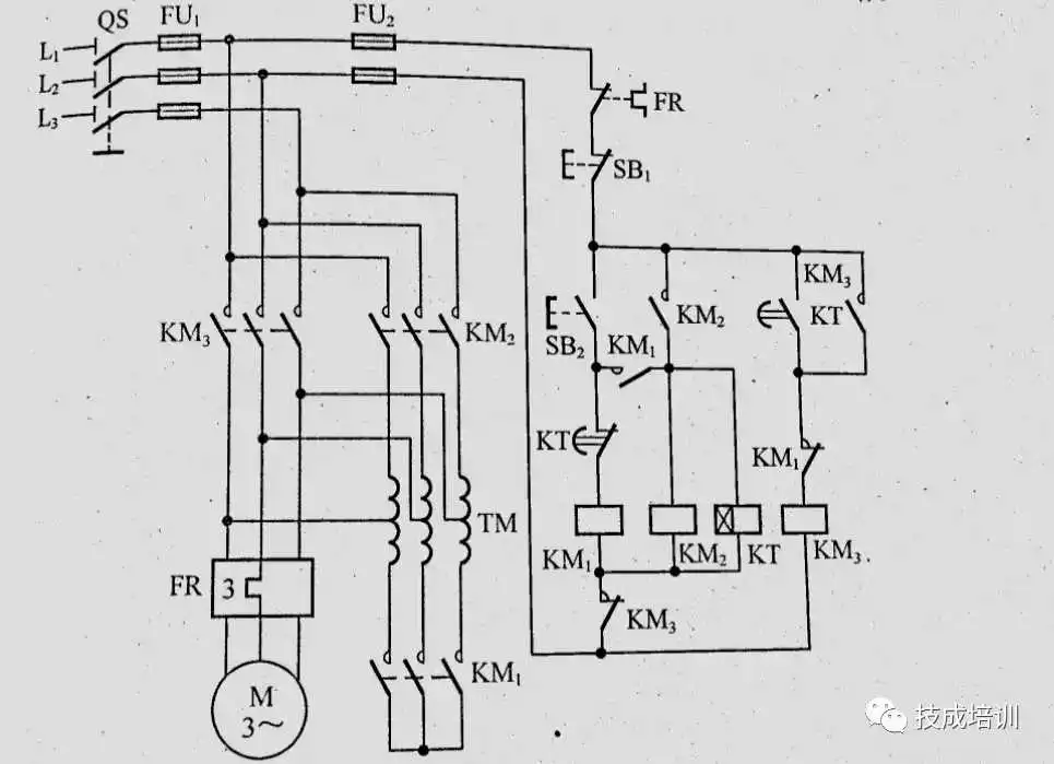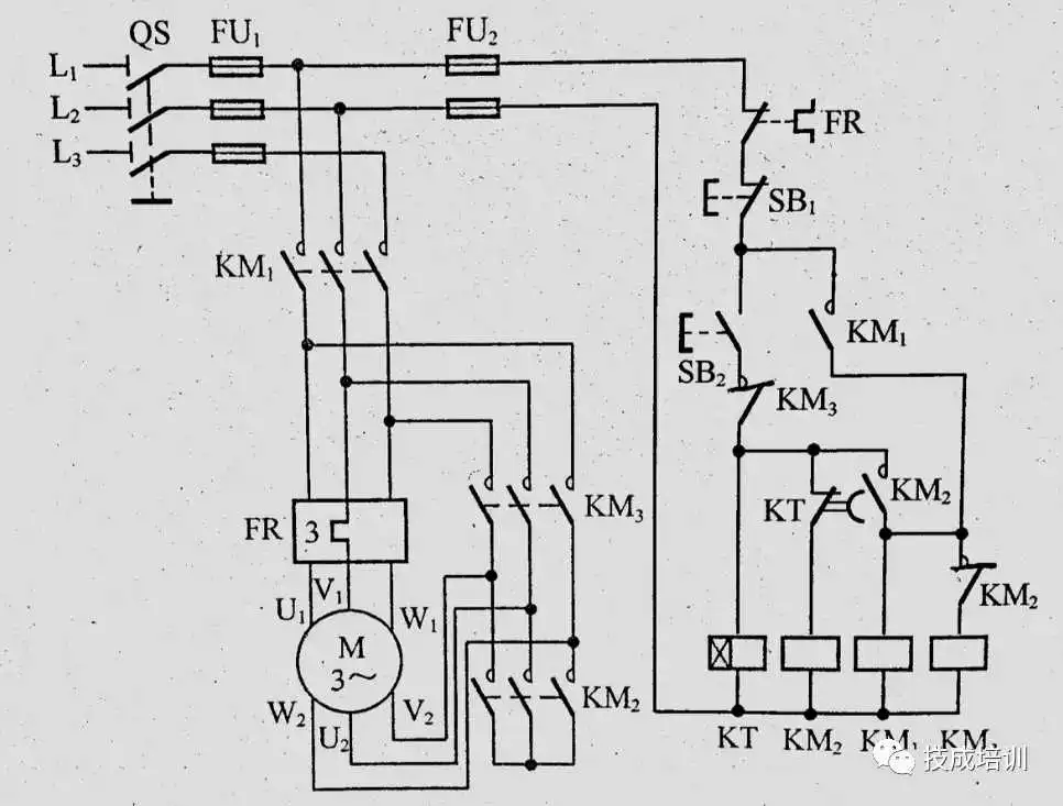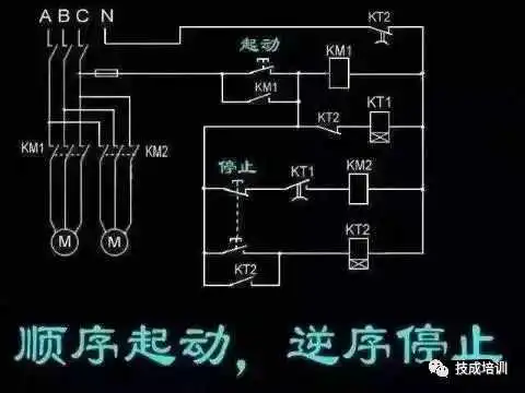 启动按钮按下后km1吸合并保持,KTI1延时后KM2工作;停止按钮按下后,km2先断电停运,经KT22延时后km1断电停运。