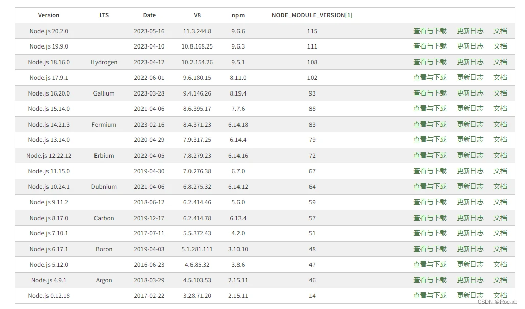 下载一个nodejs版本,可以在这里找到对应的nodejs版本号:以往的版本 | Node.js