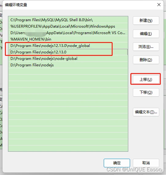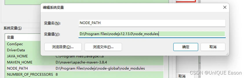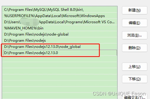用户变量中选择Path,然后将D:Program Files odejs12.13.0,D:Program Files odejs12.13.0 ode_global两个地址添加进去