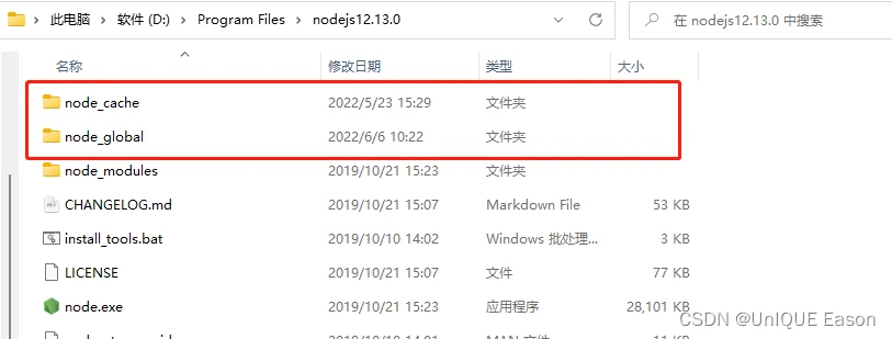 我安装到了D:Program Files目录;完成之后打开文件夹,在D:Program Files odejs12.13.0目录下新建两个文件夹:node_cache和node_global,主要是防止执行其他安装命令时候将东西安装在C盘里面