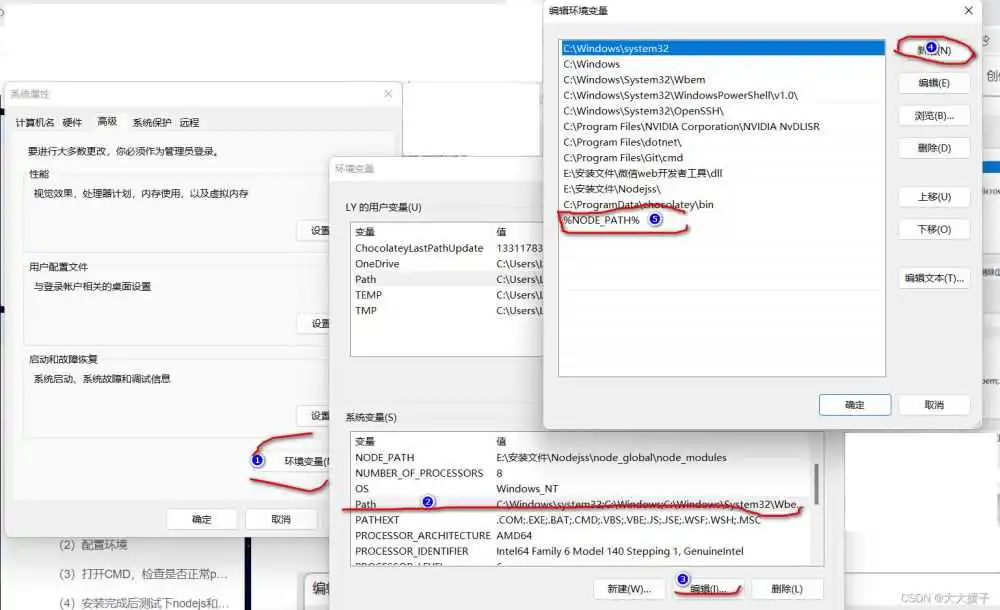 第二步: 在系统变量中选中Path一行,点击编辑-----新的弹窗再点击新建-----输入 %NODE_PATH%。最后点确定