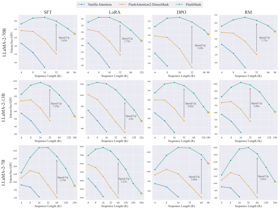 在 Llama-2 7B、13B、70B 等模型规模下,针对 SFT、LoRA、DPO、RM 四种下游训练场景和不同序列长度的实验表明,FlashMask 在各个模型规模和序列长度下均实现了端到端的加速和存储效率的提升。相比现有的基于稠密掩码矩阵的计算方法,FlashMask 实现了1.65倍至3.22倍的吞吐量提升,并支持更长的序列长度。