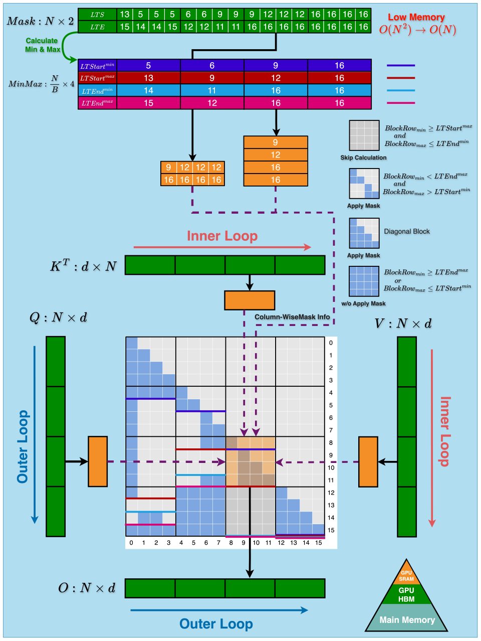 其中 N 为 Key 的序列长度, 为二维的稠密掩码矩阵的第 j 列, 为连续的行索引区间,表示 到 的连续 Query token 是被 mask 掉,置为无效 Attention 计算。