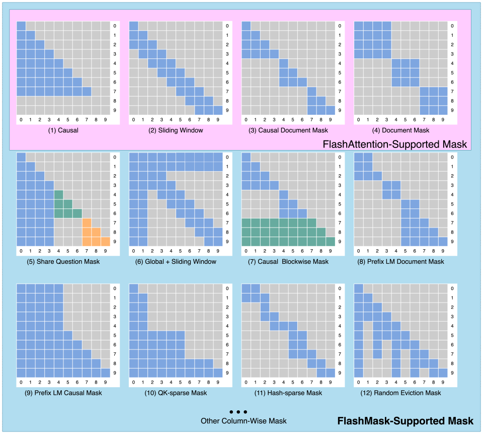 FlashMask 支持多种注意力模式,包括因果掩码(单向注意力)和文档掩码(双向注意力),因此能够灵活地应用于需要混合注意力的场景。例如: