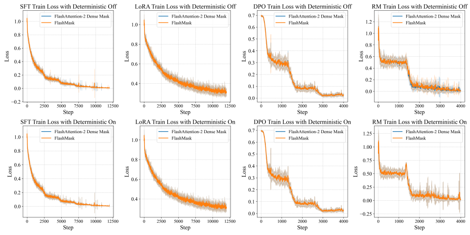 FlashMask 充分利用了注意力掩码中的稀疏性,通过跳过完全掩码块的计算,减少了计算开销,同时不改变算法的精度。与使用稠密掩码矩阵的注意力计算保持比特级别的数值等效性,确保了精度无损。