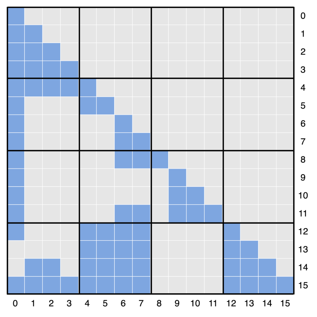如图2所示,我们展示了16个 Query token 和16个 Key token 做 Attention 计算时较为复杂的二维稠密因果注意力的掩码矩阵,灰色单元格是 mask 区域。
