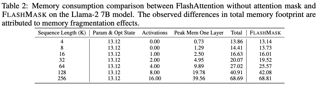 表2 在 Llama2 7B 模型上 FlashMask 对比 FlashAttention (Causal=True) 的显存消耗,单位(GB)