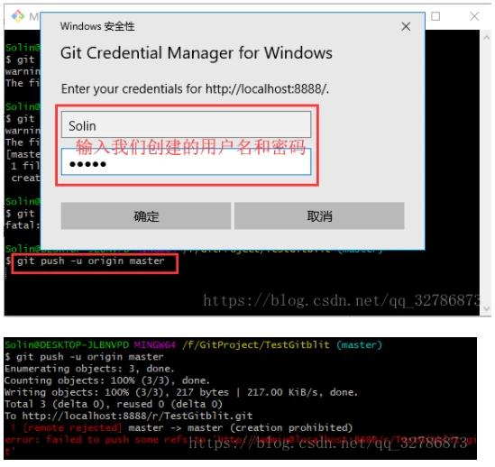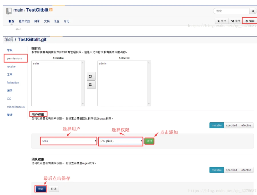 远程仓库拒绝了,是什么原因呢?因为我们创建版本库的时候选择的是限制推送(指定用户),所以我们需要为我们刚才创建的用户设置推送权限。