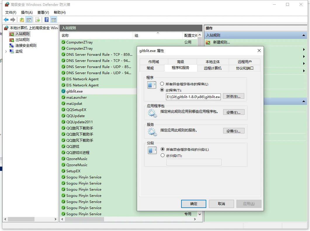 3.配置入网规则(防火墙和网络中点击高级管理即可找到),新增入网规则,选择程序,运行路径选择前面配置的E:Gitgitblit-1.8.0x86gitblit.exe,或E:Gitgitblit-1.8.0amd64gitblit.exe