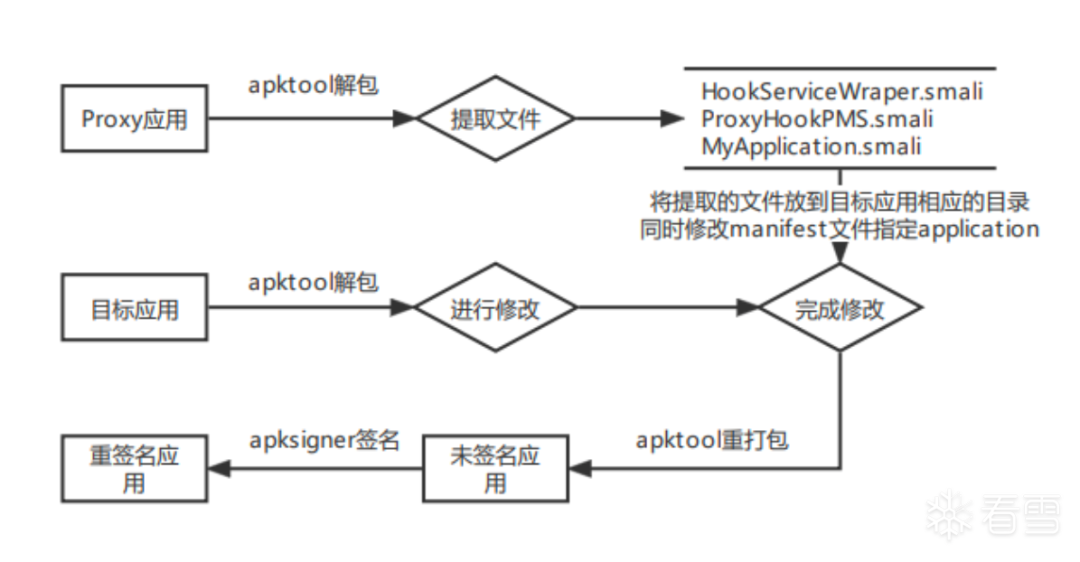 具体操作流程:创建一个和目标应用相同包名的新应用,里面用通过动态代理的方式实现PackageManagerService服务的替换,在触发getPackageInfo接口时将获取到签名信息使用目标应用的官方签名替换。具体流程如下图所示: