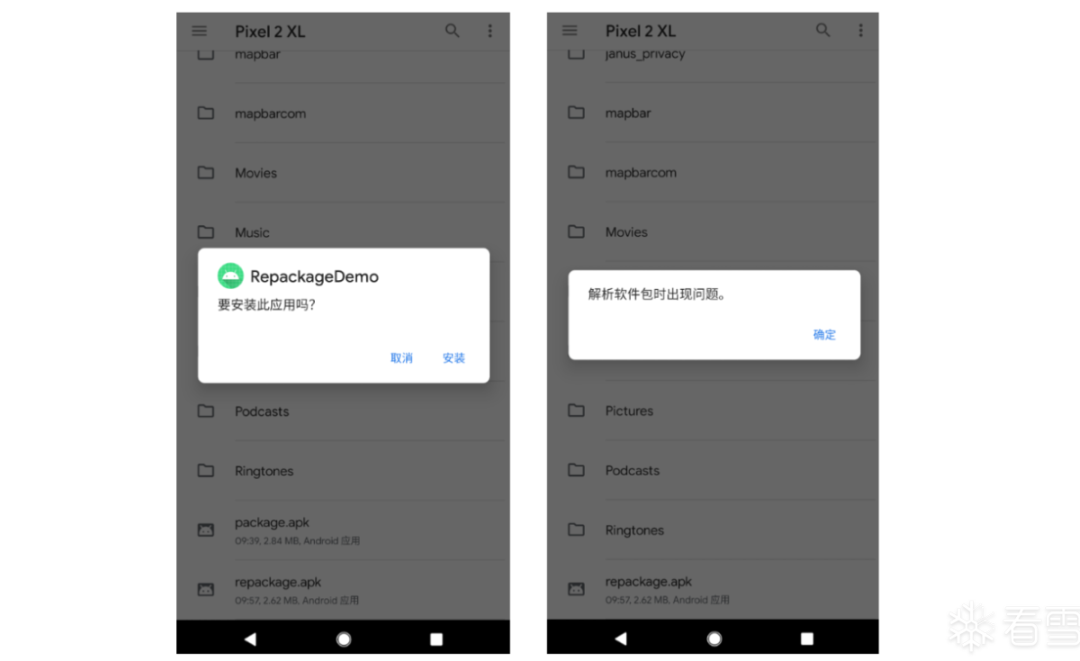 将App解包后的文件篡改后重新进行打包,因为文件的Hash值已经变动与原签名信息不匹配,无法通过App的签名校验的,这将导致篡改后的文件无法正常安装到设备,具体如下图所示。