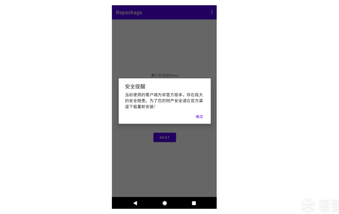 目前大多数的开发者会在APP运行时获取当前的的签名信息,并将获取到的与正版签名信息进行比对,以确保自己的App是受到二次打包重签名攻击。通常开发者检测到App被重打包篡改后,会对用户进行安全提醒。例如如下图所示: