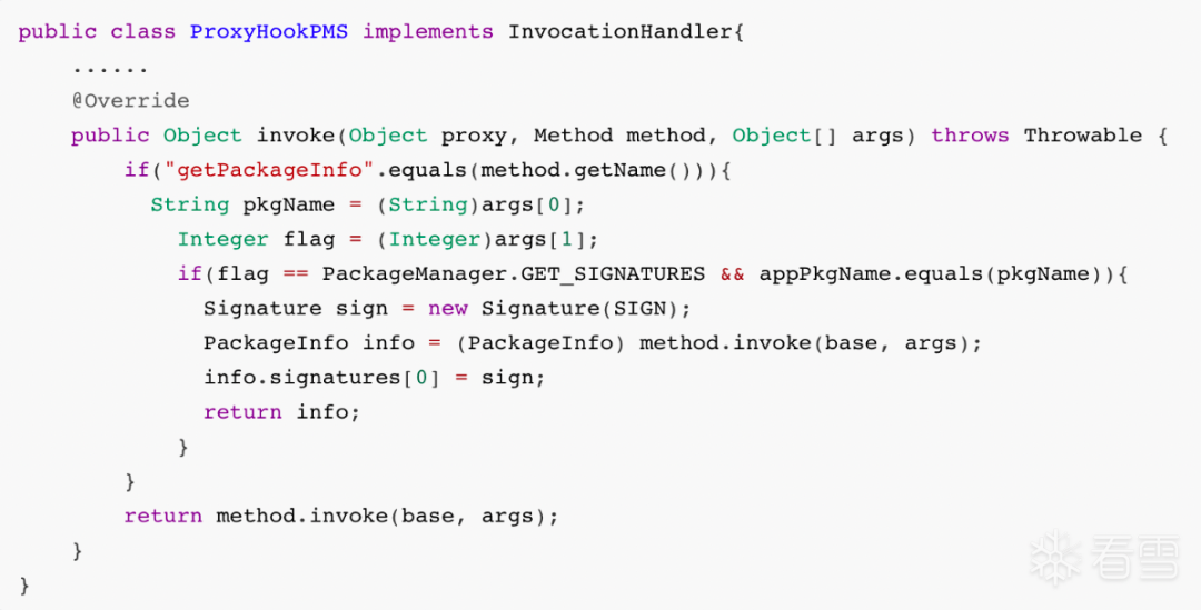 实现原理,即通过PackageManagerService服务简称PMS获取的的应用签名信息,可通过反射结合动态代理的的方式控制PMS返回值,从而达到替换签名的目的。