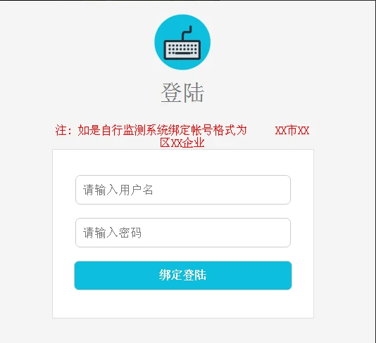 账号格式为:XX市XX区XX(最后一个XX为企业名称),即为原自行监测系统登录页面,第一,第二,第三行输入内容的拼接,例子看下图: